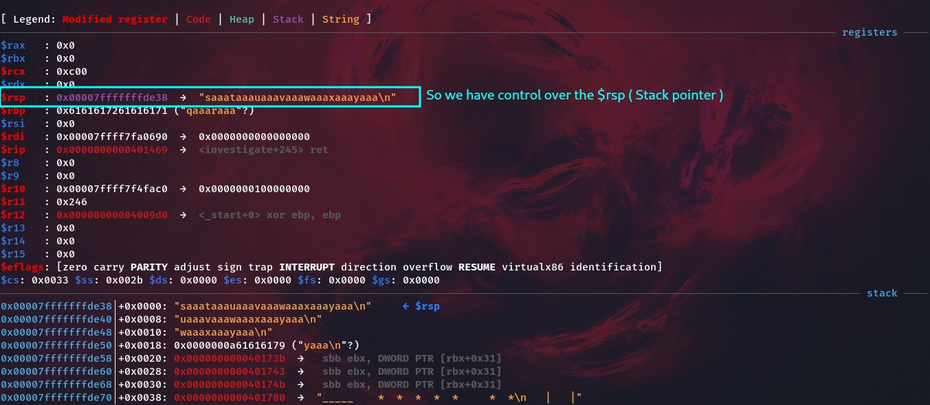 So we basically have to find the offset in investigation function, overflow it and set the