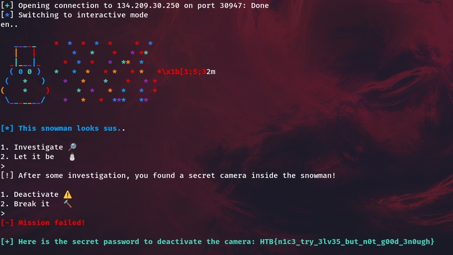 "\n[!] After some investigation, you found a secret camera inside the snowman!\n\n1.Deactivate ⚠\xfe0f\n2. Break it 🔨\n> "