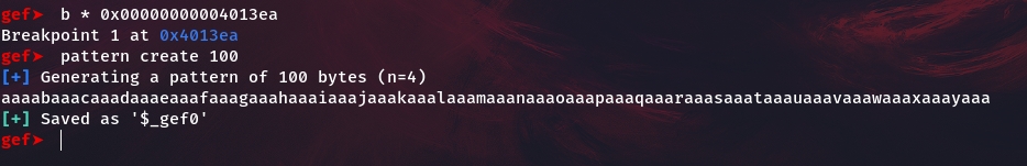 exitininvestigate()[ address of exit : 0x00000000004013ea ] and create a pattern to find offset