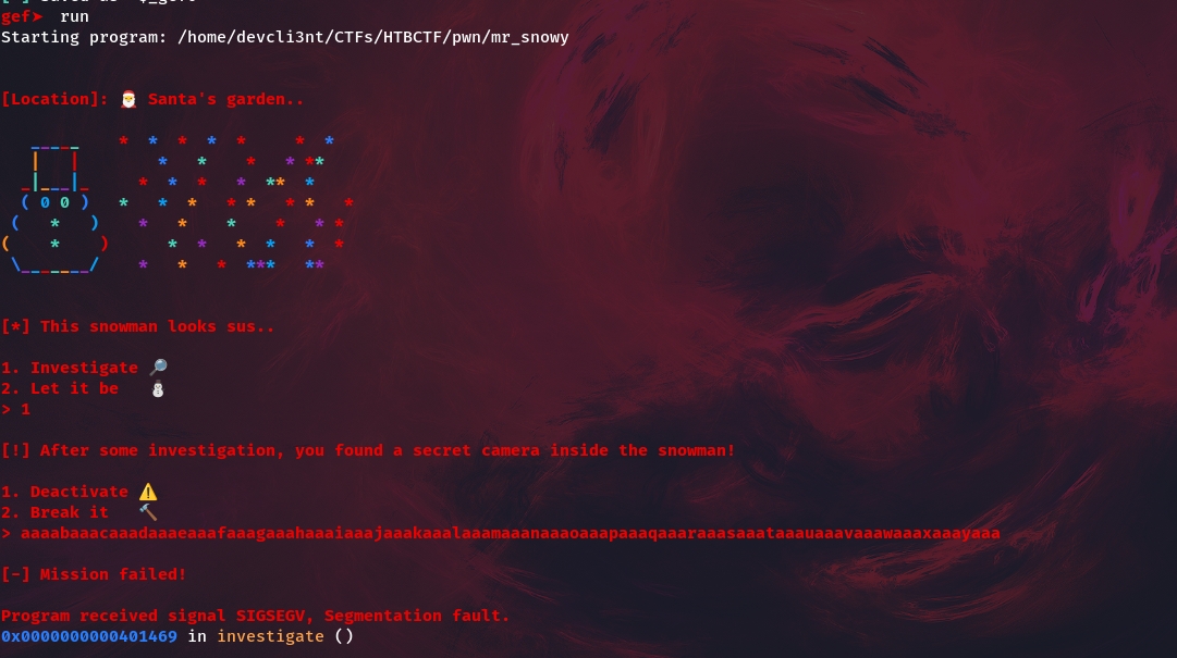 printstr("\n[*] This snowman looks sus..\n\n1. Investigate 🔎\n2. Let it be ⛄\n> ");